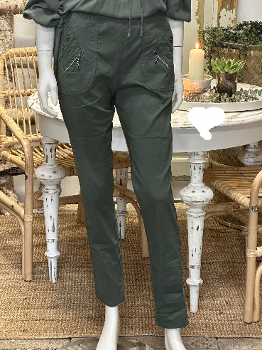 Designet har elastik i taljen for en fleksibel og behagelig pasform samt praktiske sidelommer. Som ekstra detalje har bukserne knap- og lynlåsdetalje ved lommerne, som tilføjer et moderne twist. Stoffet har stræk, hvilket giver god bevægelighed og gør dem ideelle til både hverdagsbrug og afslappede aktiviteter.
