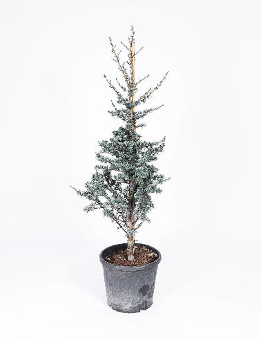Smukt cedertræ med karakteristiske sølvblå nåle og et elegant, opret vækstmønster. Træet måler ca. 1 meter i højden og leveres i potte, klar til at pryde haven, terrassen eller som dekorativ krukkeplante ved indgangen.