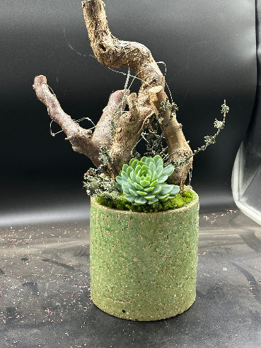 Hyggelig dekoration i grøn potte med stor eckeverie løg og lyskæde.