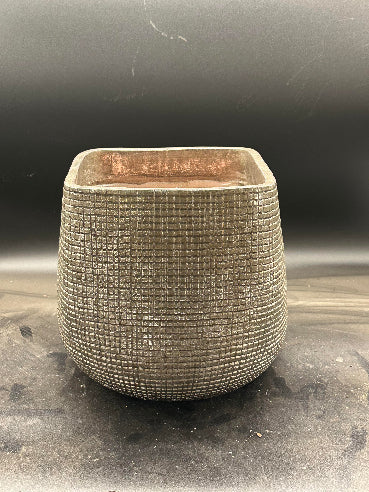 Elegant og rustik indendørs krukke med en metallisk overflade, der giver et eksklusivt og moderne udtryk. Overfladen har et diskret firkantet mønster, som tilføjer struktur og dybde, mens den dæmpede metalglans skaber et smukt spil i lyset.