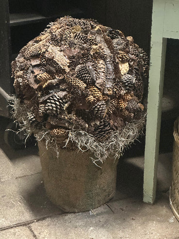 Stor og stemningsfuld kogledekoration lavet i hånden af naturens egne materialer. Sammensat af forskellige kogler, barkstykker og mos, der giver et rustikt og naturligt udtryk.