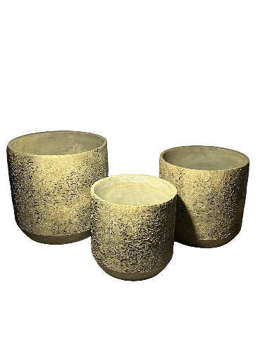 Smukke indendørs krukker i et rustikt og moderne design. Krukkerne har en mat, gylden-brun overflade med en flot, krakeleret struktur, der giver et unikt og håndlavet udtryk. De passer perfekt til både grønne planter og blomstrende dekorationer og tilfører et varmt og naturligt præg til indretningen.