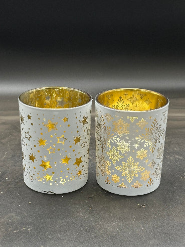 Smukke glas i hvid og guld med elegante motiver af stjerner og snefnug. Glasenes inderside har en gylden finish, som giver et varmt og hyggeligt lys, når du tænder et fyrfadslys eller bloklys i dem.