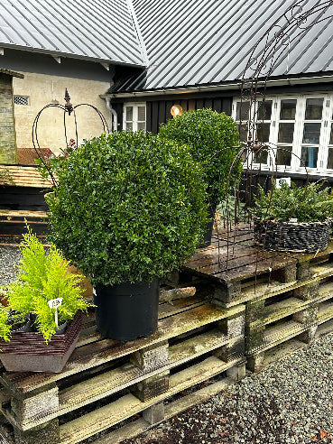 Denne buksbom måler ca. 1 meter i diameter og er ideel som solitærplante ved indgangen, i store krukker eller som blikfang i haven. Den er hårdfør, formstabil og let at holde i form med let beskæring.