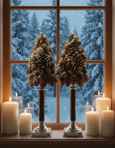 Unikt håndlavet naturtræ skabt af kogler, nødder, mos og andre naturlige materialer. Hvert træ er monteret på en elegant fod i sølv og mørk træfarve, som giver et flot og eksklusivt udtryk.
