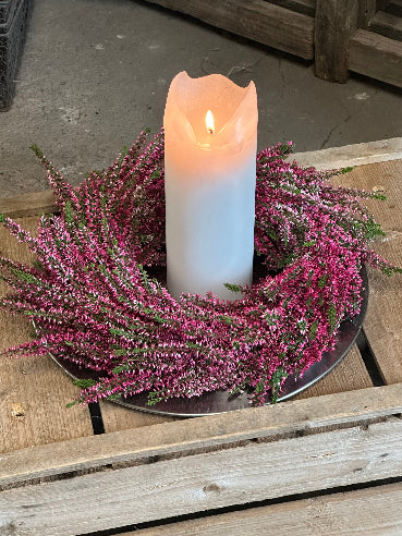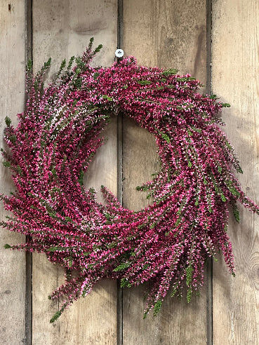 Hver krans er unik og bundet i hånden med frisk lyng, der tørrer smukt ind og holder længe.
