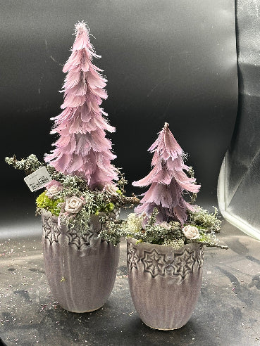 Sød dekoration med rosa juletræ i potte. Pyntet med mos og lavgrene.