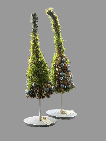 Her får du et sæt med to stk. naturtræer med mos, kugler og kogler.
