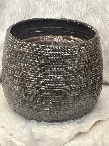 Smuk og kraftig krukke i mørke nuancer med glaseret, let skinnende overflade og diskret struktur. Perfekt til indendørs brug, da den er uden hul i bunden – ideel til grønne planter, sammenplantninger eller som dekorativ skjuler til plastpotter.